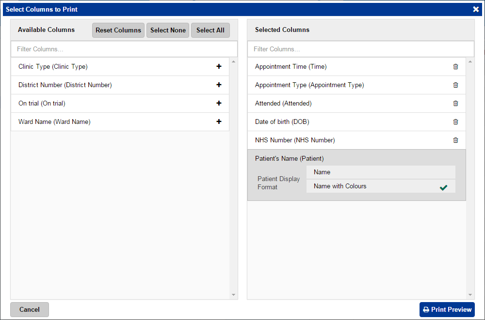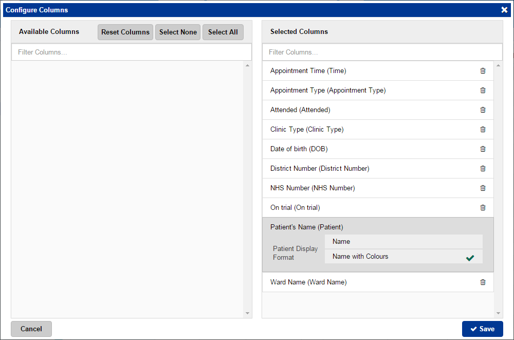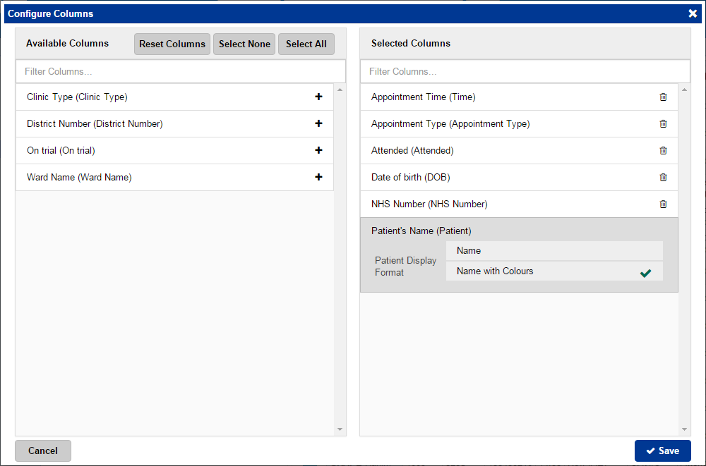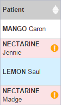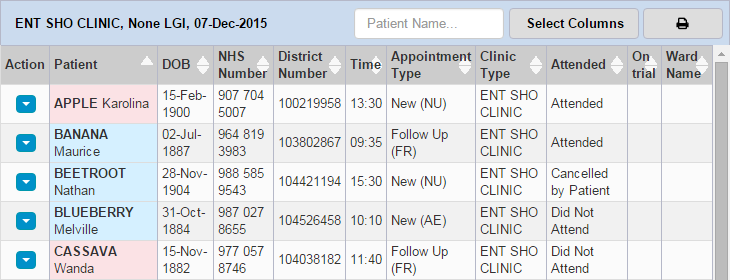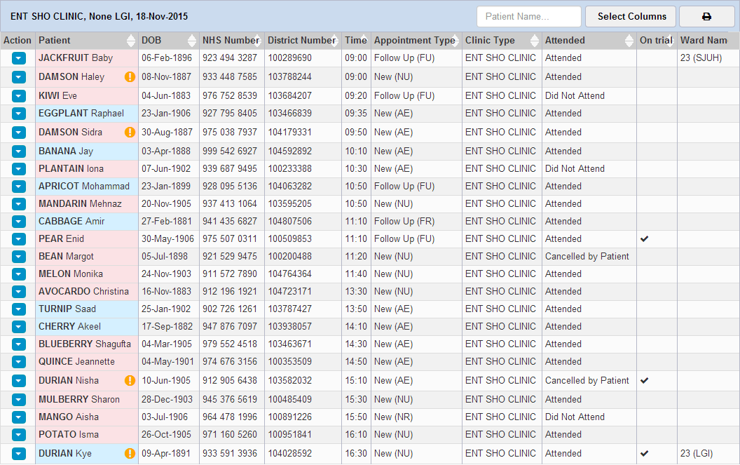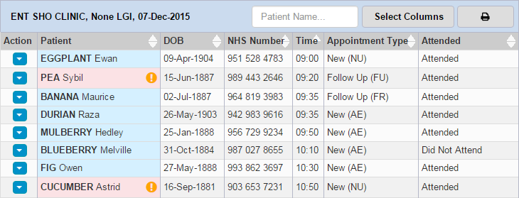 The Patient column will display the name of the patient booked into the Clinic via PatientCentre (PAS). To signify gender, the patient's name will be shaded pink for female, blue for male, and no shading for indeterminate or unknown: