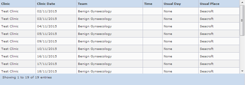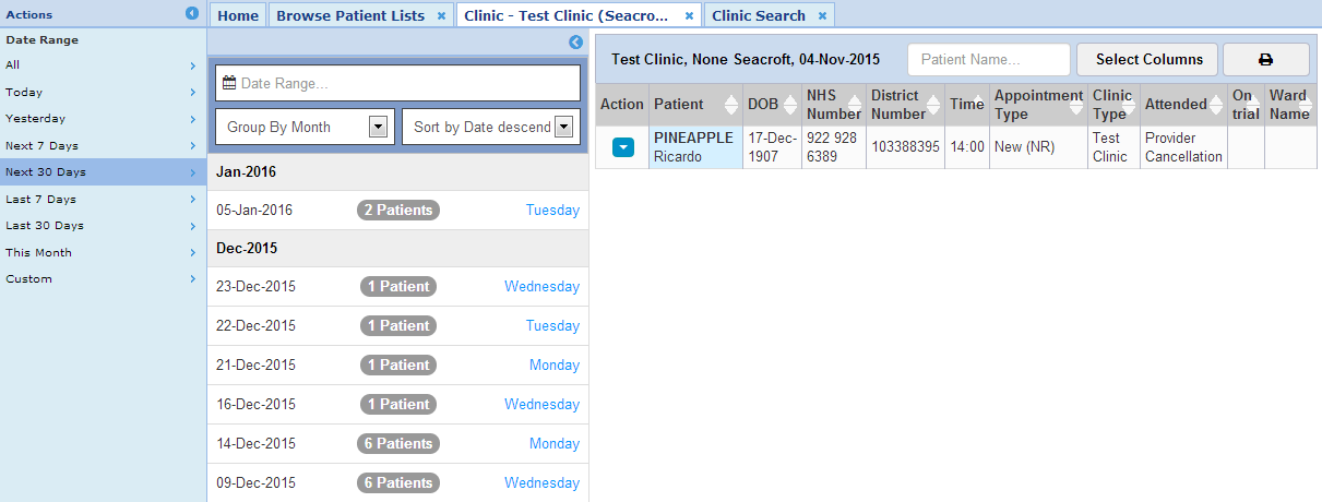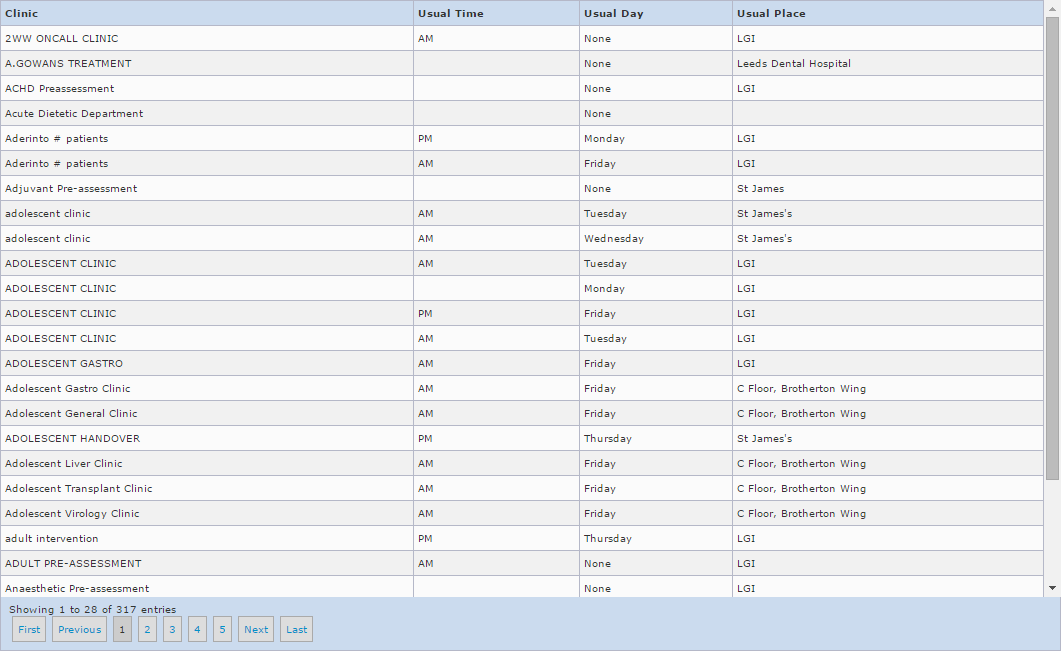 PPM+ pulls clinic information from PatientCentre (PAS) and displays the information like in the example below: