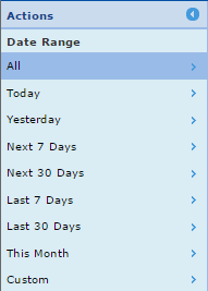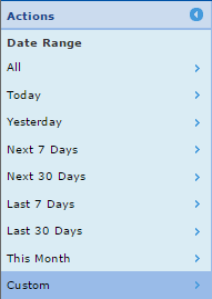 Use the Actions bar on the left to select a Date Range. You can select from either All, Today, Yesterday, Next 7 Days, Next 30 Days, Last 7 Days, Last 30 Days, This Month or Custom: