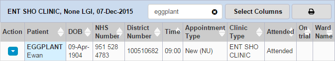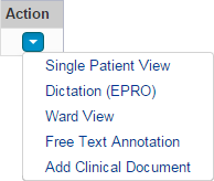 From here you can access the patient's Single Patient View, dictate/transcribe a letter on epro, access the Ward View if the patient is an Inpatient (will be displayed in the Ward Name column), add a Free Text Annotation or add a Clinical Document.