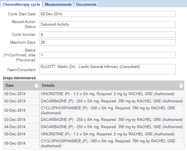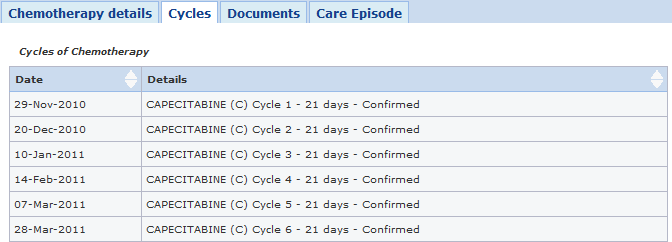 Each Chemo Cycle for this Chemotherapy can be viewed by clicking anywhere on the row or can be viewed by clicking on the Chemo Cycle results on the list of Procedures.