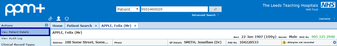 To access a patient's details and the full demographics we have on PPM+, click on View Patient Details at the top of the Actions bar like below: