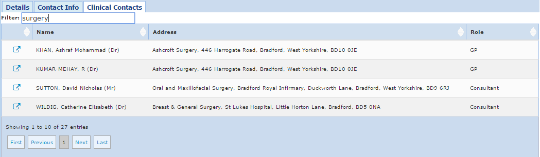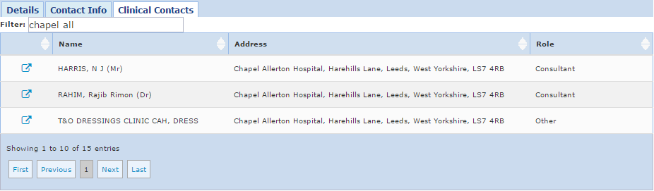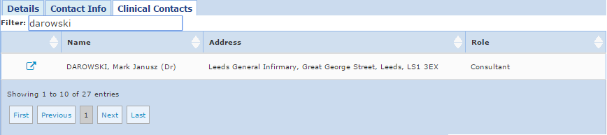If you know the name of the clinical contact you require, you can go straight to their details by entering their name into the filter: