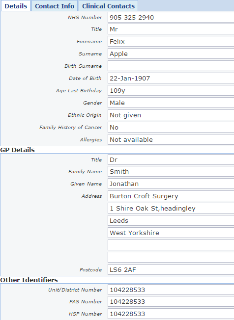 All the non-contact information we have on the patient will be displayed here. It is not always possible or applicable for every field to be complete so you may see some blanks like above.