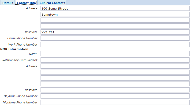 The second tab contains all the information we have to contact the patient and their next of kin (NOK). An example can be seen below: