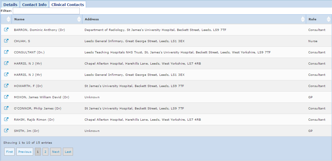 The third and final tab under Patient Details is for all the clinical contacts who have been involved in that patient's care. An example can be seen below: